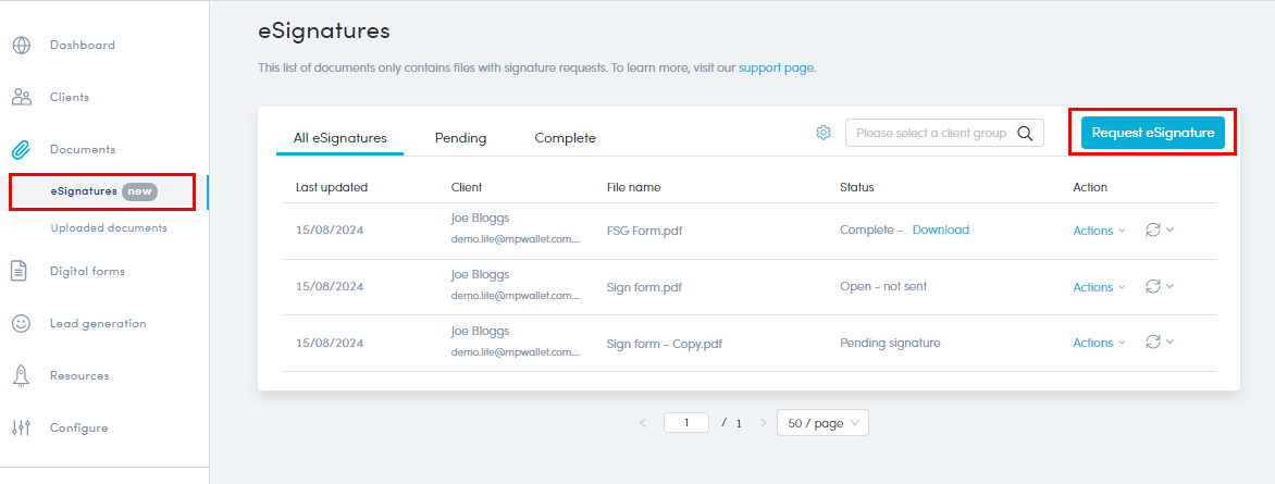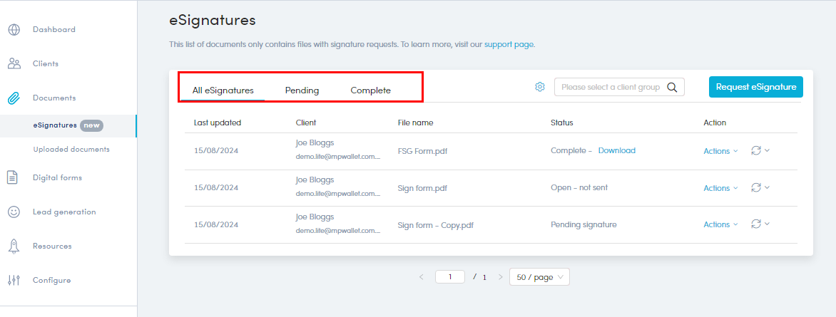 2. In the View area, you have the option to filter your view to ‘All e-signatures', ‘Pending’ documents that are still waiting to be signed, and ‘Complete’ documents.