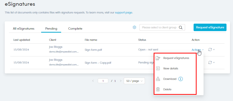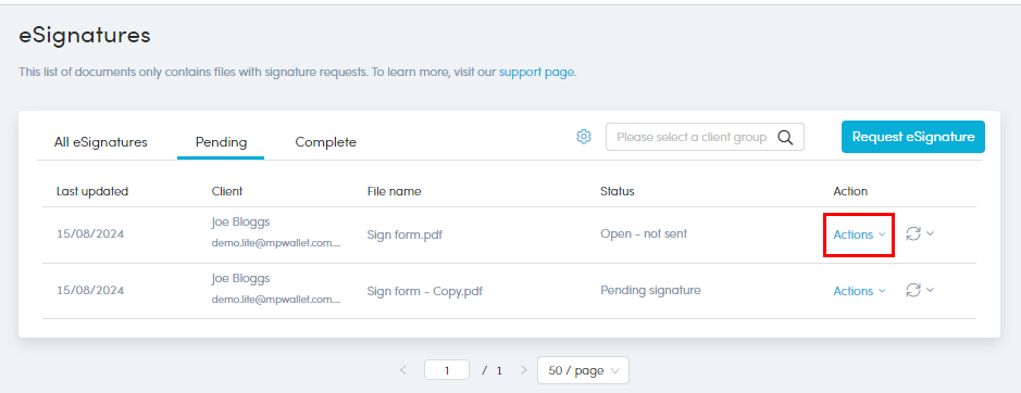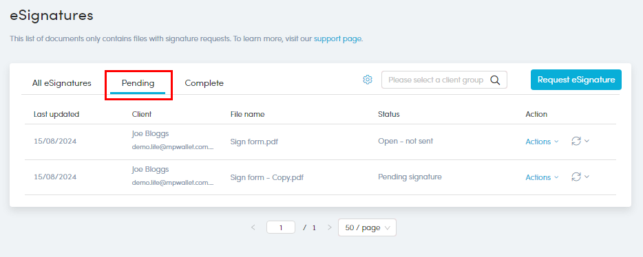 3. Click on the ‘Pending’ tile to view the last updated date, client name and email address, file sent for signing, and the Signature and Action columns.