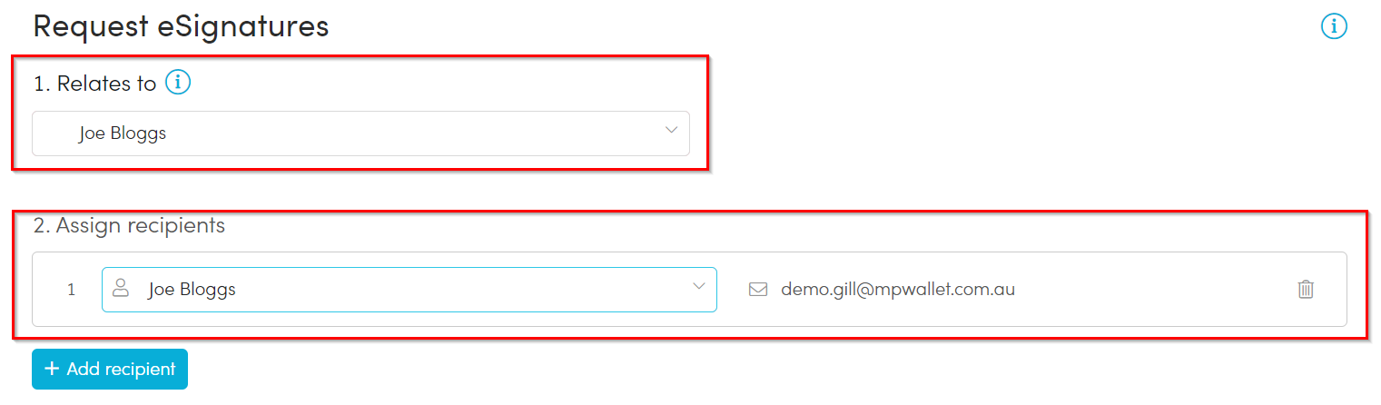 Add a recipient with shared email: Allows you to send the document for signing using an email address that already exists in the portal. This is ideal for clients who share an email address.