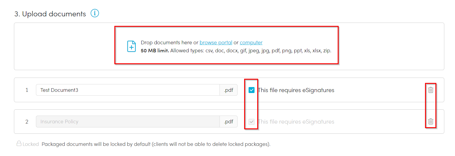 *Packaged documents will be locked by default (clients will not be able to delete locked packages).