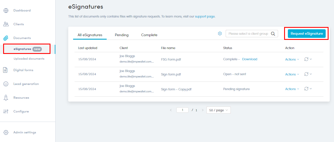 1. From the Partner portal, visit Documents>eSignatures >Request eSignature.