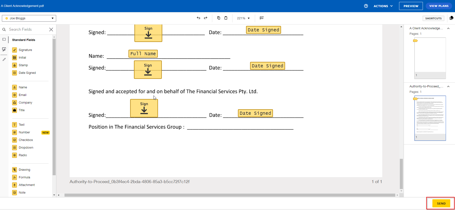 9. Once all the signature areas are added, complete and send the envelope.