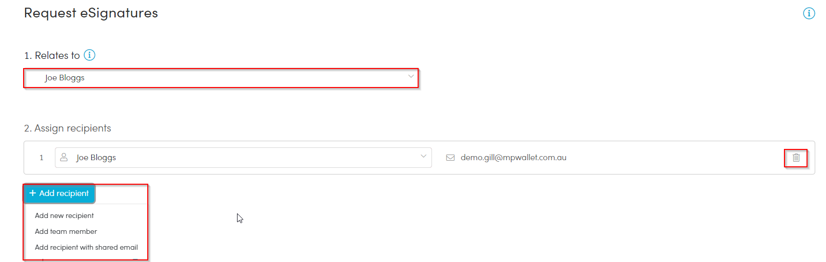 Add a recipient with shared email: Allows you to send the document for signing using an email address that already exists in the portal. This is ideal for clients who share an email address.