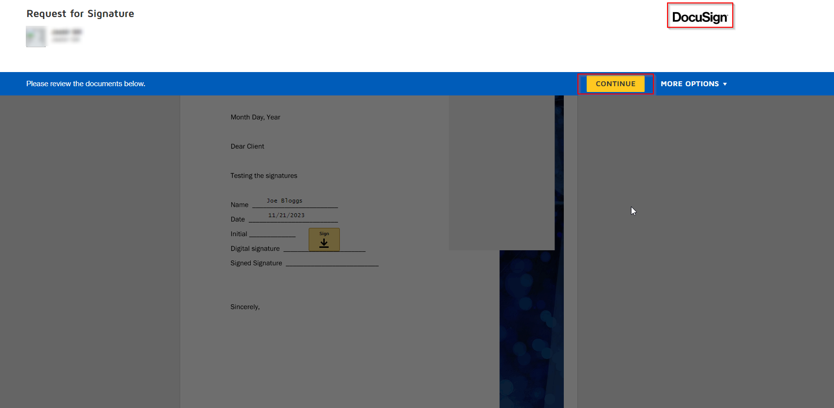 - The client will also have their reminder bell in the portal. Once they go into the document, it will redirect to review and sign in DocuSign.
