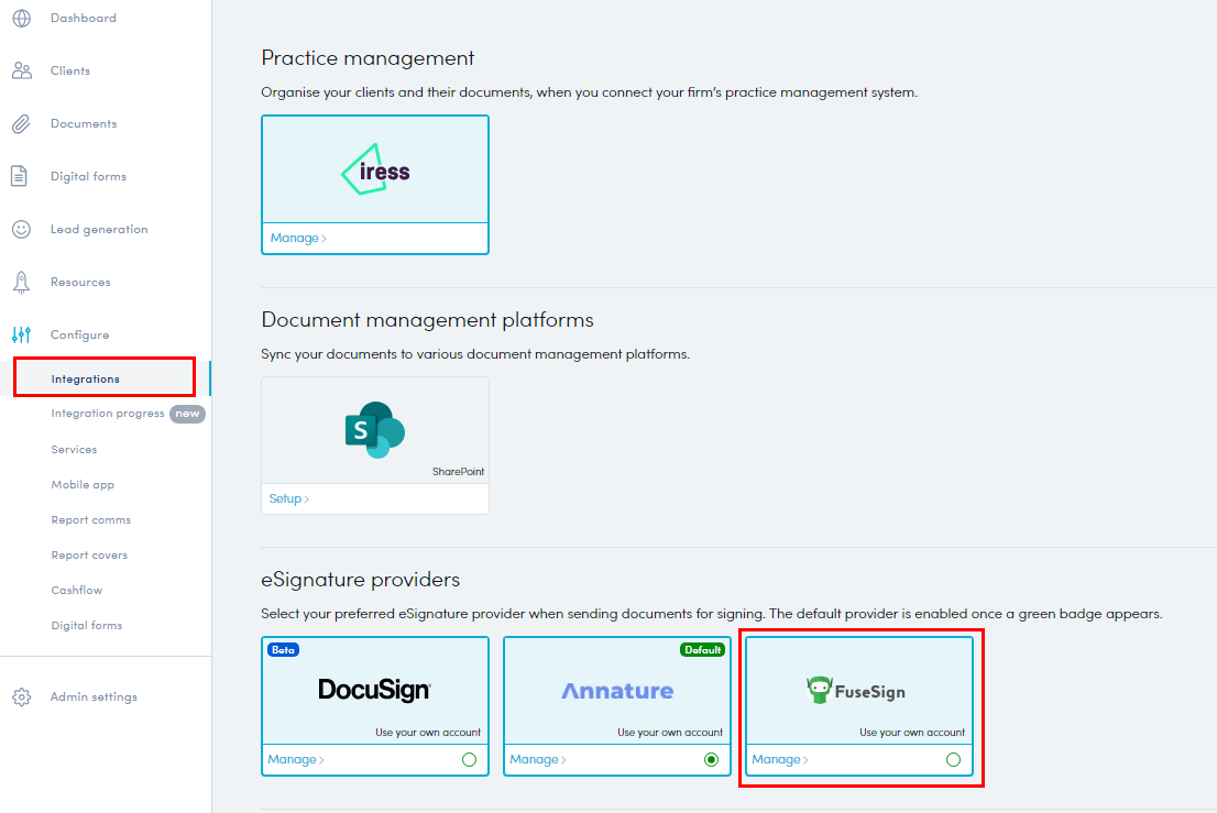 1. In your Partner Portal, go to Configure> Integrations and click FuseSign in the eSignature Providers area.