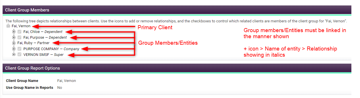 The primary client must be created as the head of the group. Each group member/entity must then be linked to the primary client ensuring the linked group member/entity shows a '+' symbol, followed by their name and then the relationship type shown in italics.