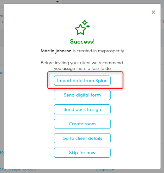 - The client has successfully been created and a confirmation window is shown. From here, click 'Import data from Xplan'.