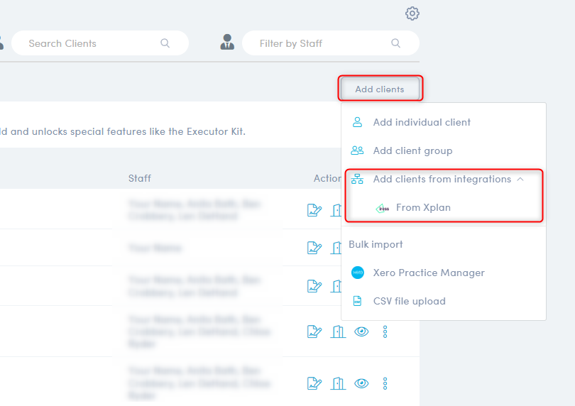 Navigate to Clients>Client List. Click 'Add clients' > 'Add clients from integrations'> 'From Xplan'.