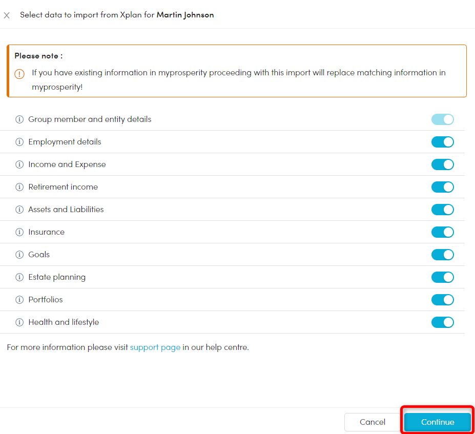 - The import slide-out window opens. Use the toggles to select the information you want to import and click 'Continue'.