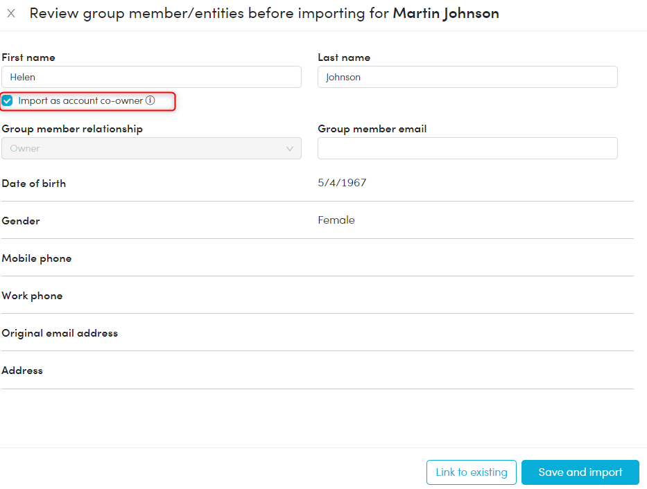 Unmark the 'Import as account co-owner' checkbox, select the client's relationship from the dropdown box and then click 'Save and Import'.