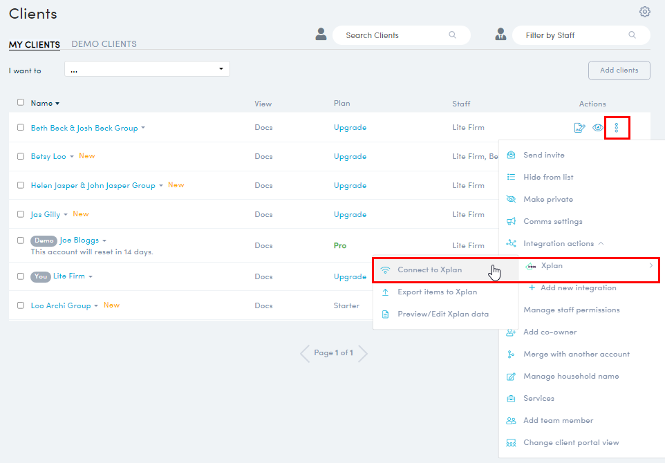 - Navigate to the Client List and locate the Client. Click 'More Actions'>Integration actions>Xplan>Connect to Xplan.