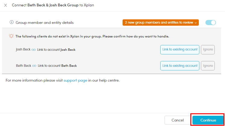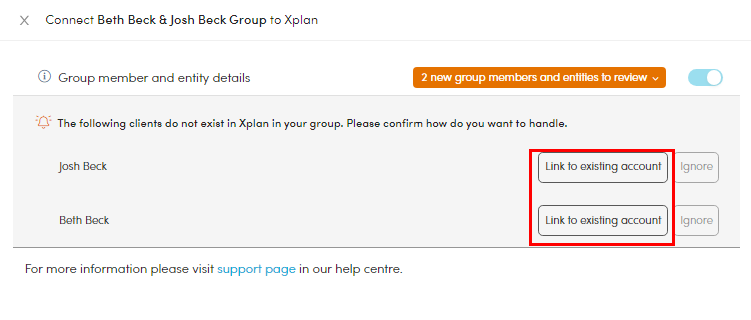 - A slide out window appears. Click 'Link to existing account' for each owner in the group.