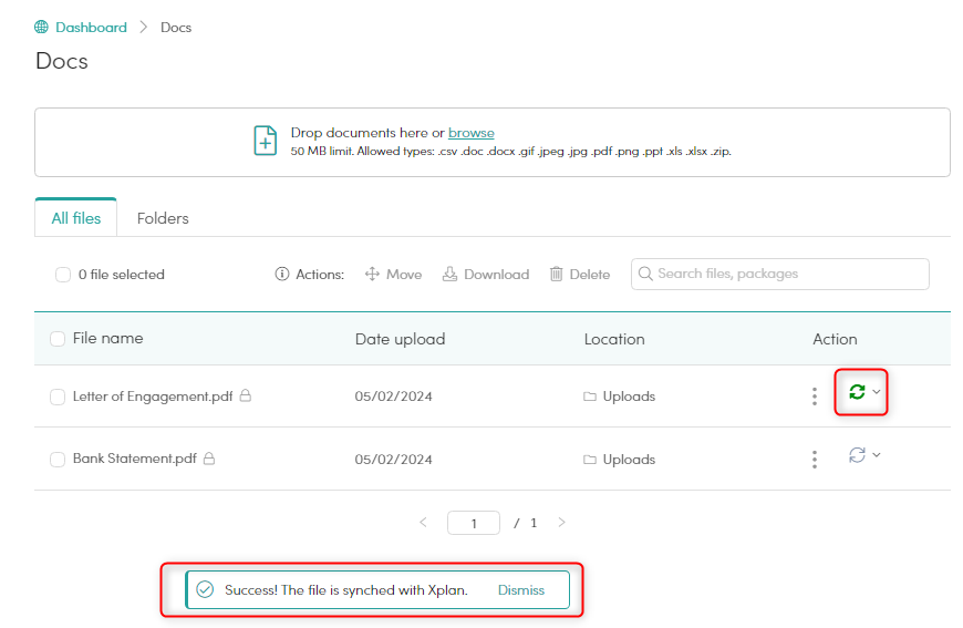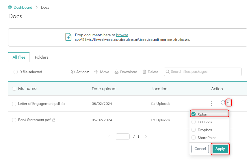 The integration with Xplan enables you to selectively export documents from the portal to Xplan on a document-by-document basis. This feature is a one way export from the portal to Xplan.
