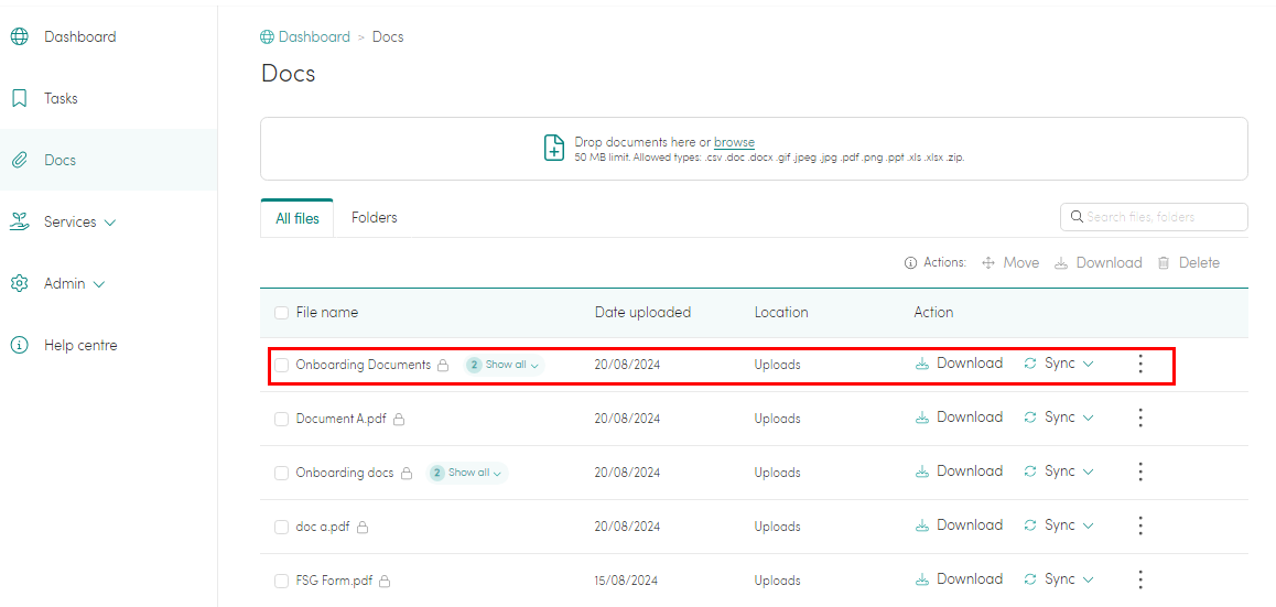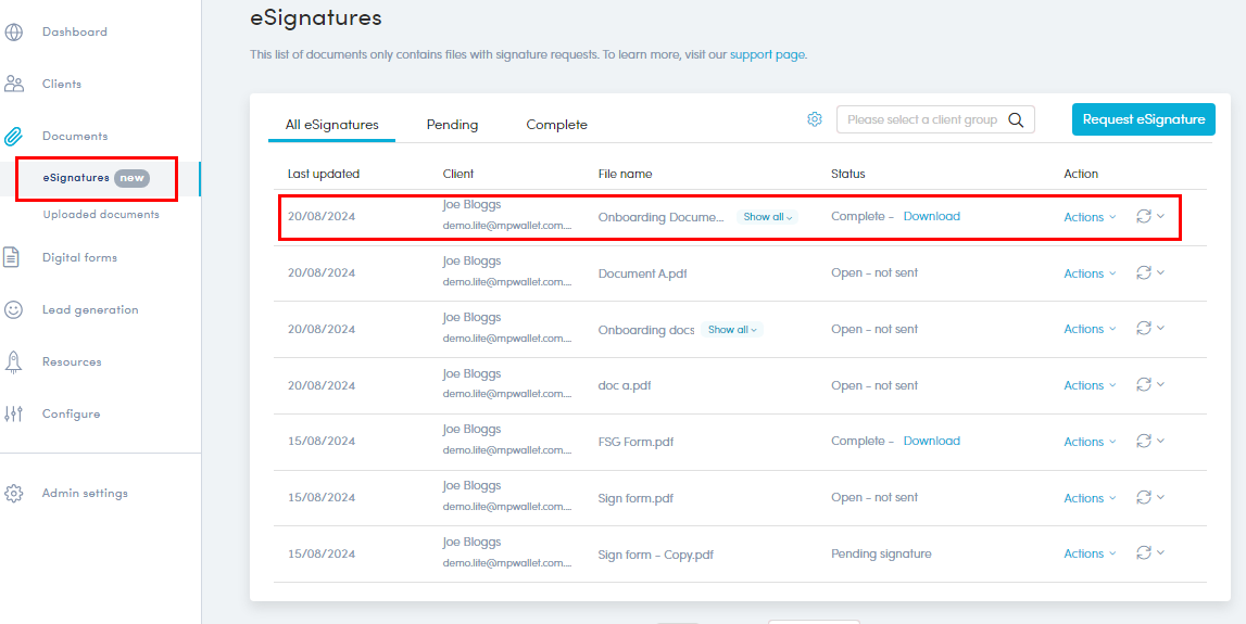 1. Locate the document you want to export from either the 'Uploaded Docs' or 'eSignatures' area of your Partner Portal, or the 'Docs' area of the Client portal.