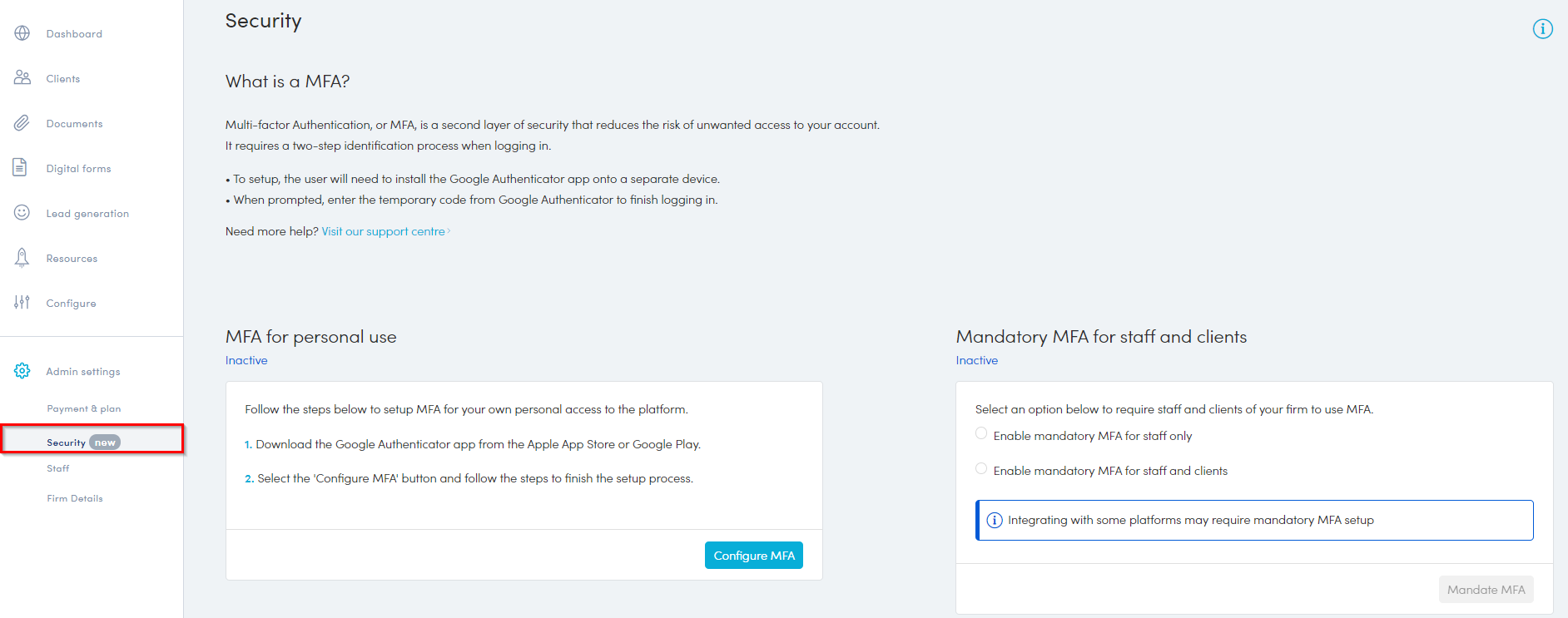 2. Under mandatory MFA for staff and clients, click Enable Manadatory MFA for staff and clients and click Mandate MFA