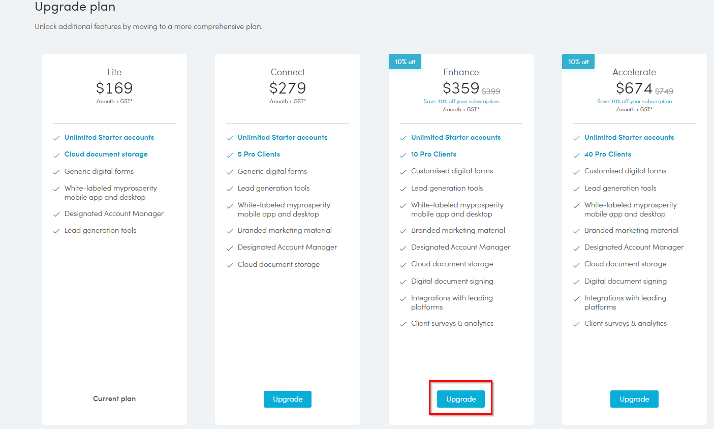 Once your plan is selected, a confirmation page will open. To confirm your plan, click ‘Upgrade’.