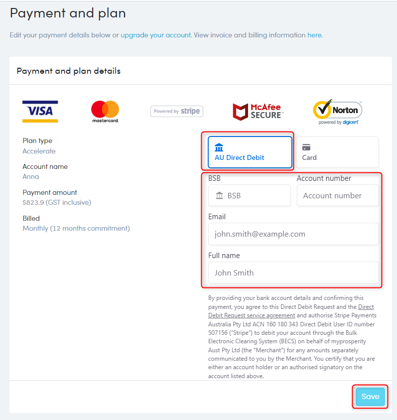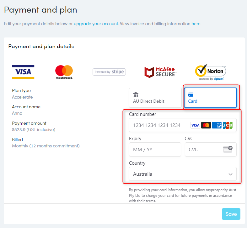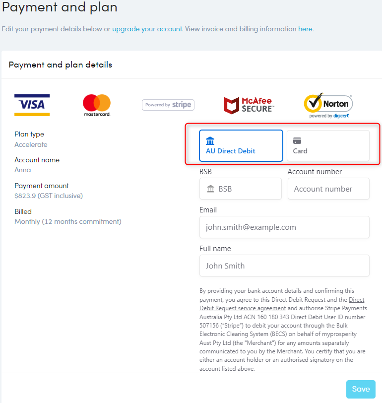 - Select your payment type: AU Direct Debit or Card.