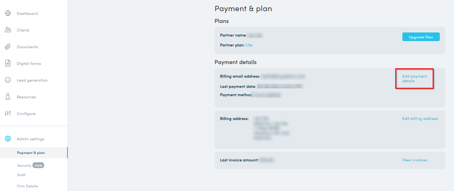 - In the Partner Portal. Click Admin Settings>Payment & Plan>Edit payment details.