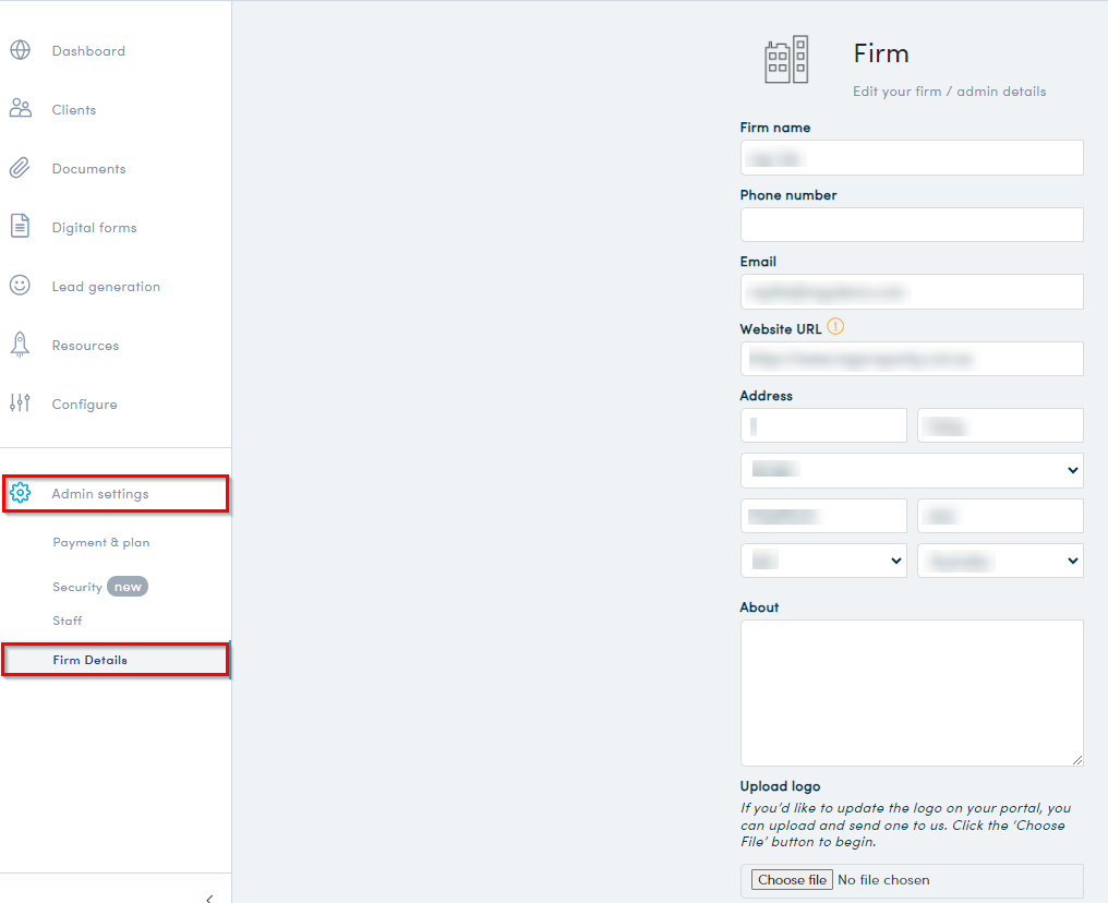 - In your partner portal, navigate to Admin settings>Firm details.