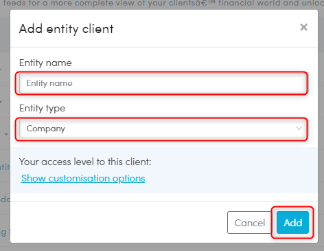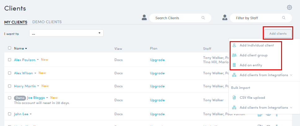 - In your Partner Portal, visit Clients>Client list. Click Add Clients and select either an individual, client group or entity.