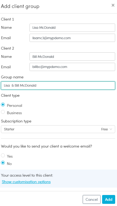 b) For Client Group( Spouses/Partners/Co-owners) : Enter the names, email addresses and adjust the Group name(optional) and advise if they are a Personal or Business client and click the ADD button. Their details will then populate on screen in your clients list.