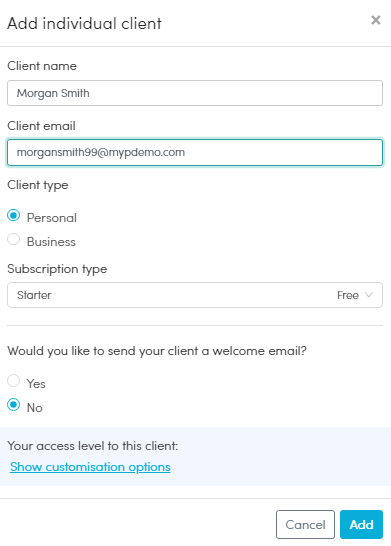 - a) For Individual: Enter their name, email address and advise if they are a Personal or Business client. You can also choose their subscription type, and whether an invitation email is sent or not. Their details will then be added to your clients list.