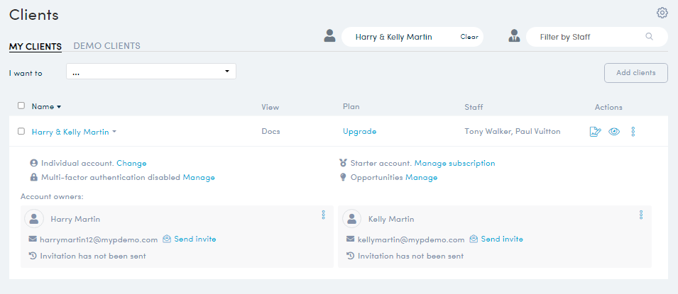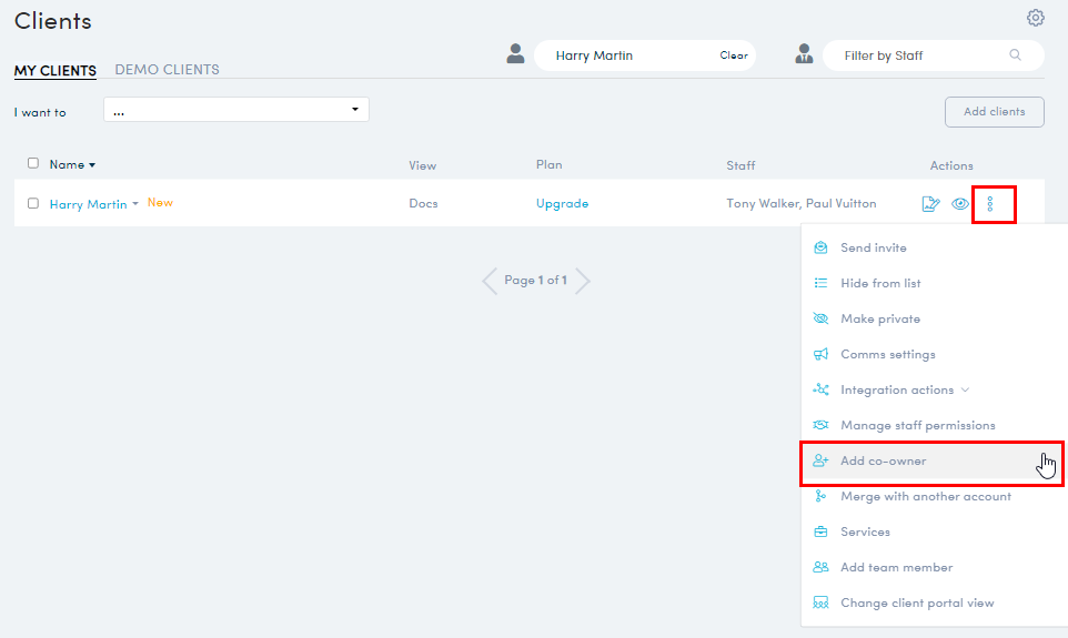 - Find the Client in the Client list, click 'More options'>'Add co-owner'.