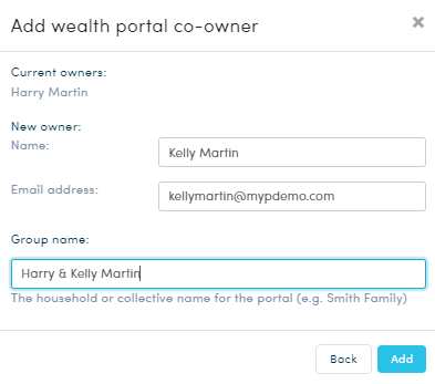 - In the pop up window, add the Name of the new co-owner, their email address and adjust the Group name (optional). Click Add.