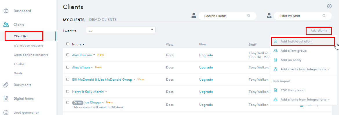 1. Navigate to Clients> Client List> Add Clients> Add individual client