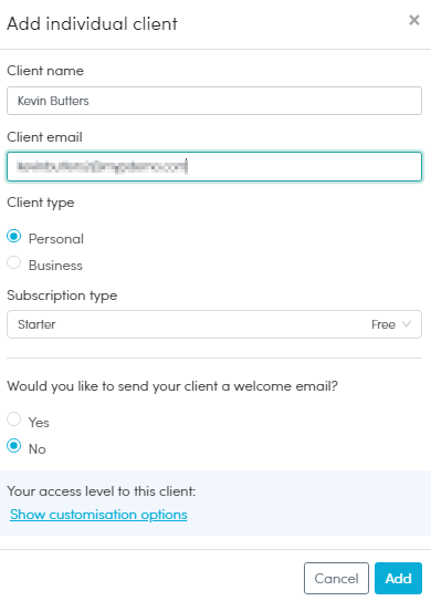 2. Add the primary client's name into the Client name field, along with their email address and click 'Add'.