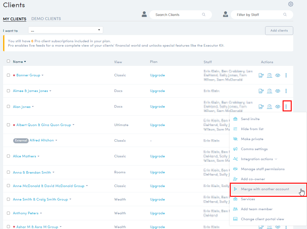 - Locate the Client in the Client list, click 'More actions'>'Merge with another account'.