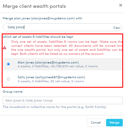 - Once a client is selected from the search, the window expands for you to choose which client’s Assets and Liabilities should be kept. You are informed of the current values in the accounts to assist with the correct decision.