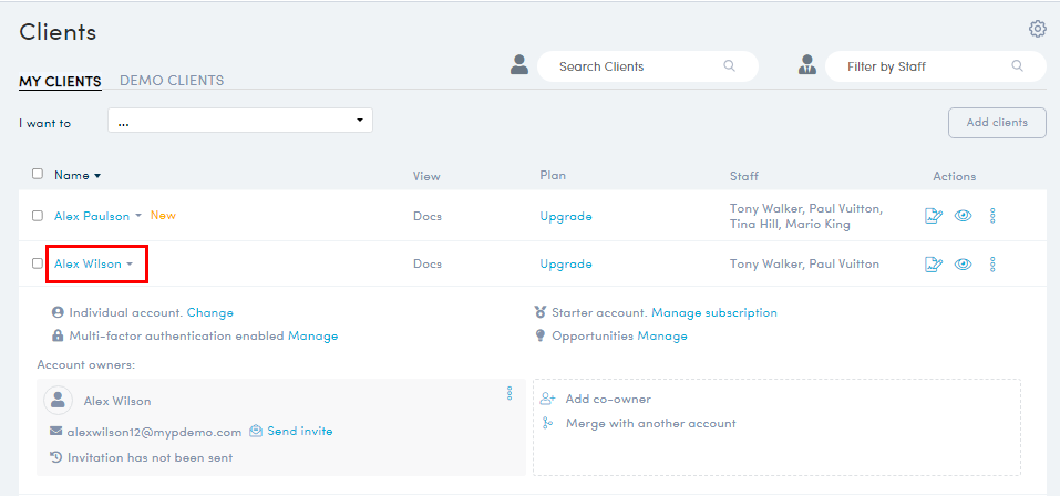 This will provide you with information such as activation status, last log in date, pro or starter account subscriptions and assigned staff. For more information see How do I export my client list to CSV?