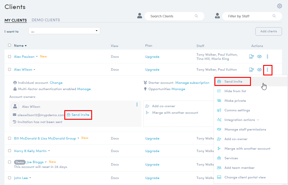 - Click ‘Send Invite’ for each client in the group OR click 'More actions'>'Send invite' to send all owners of the group an invitation.