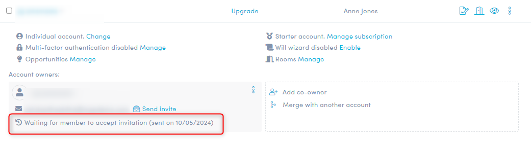 Once the page is refreshed, the client details will display the message: ‘Waiting for member to accept invitation (invitation date sent)’ and Send invite will appear again should you need to resend the invitation. - Once a client has set up their account, the client's details reflect their last login date.