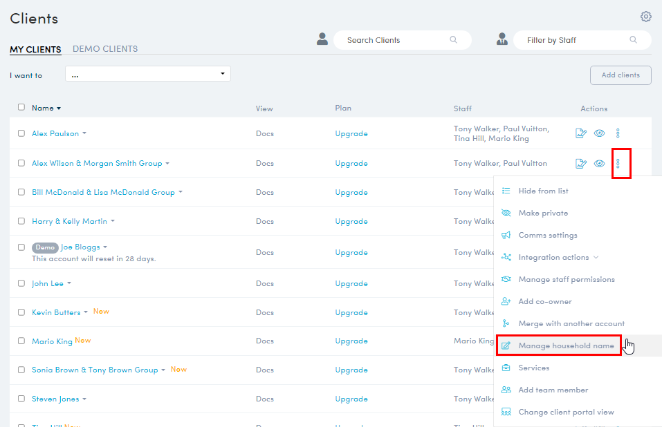 1. In your Partner Portal > Clients > Client List >More actions>Manage Household name