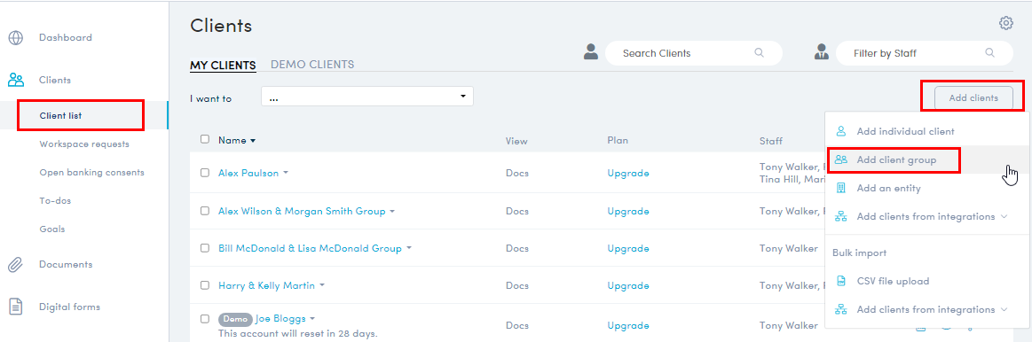 1. In your Partner Portal > Clients > Client List > Click Add Client group