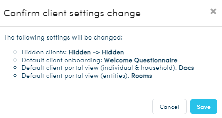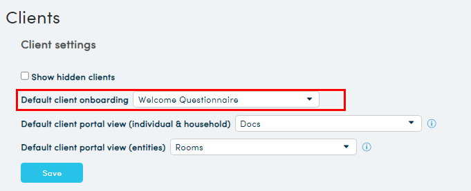 - Client settings will appear. Click the dropdown box next to 'Default client onboarding'.