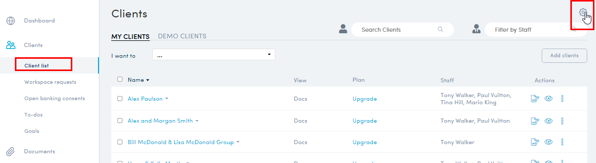 - Navigate to Clients >Client List and click the Settings cog at the top right hand side of the Client List page.