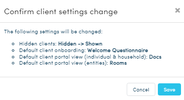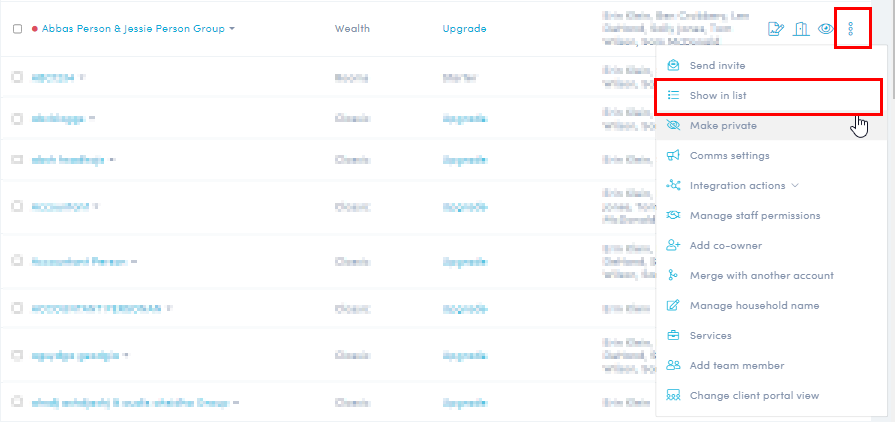 To unhide, locate the Client in the Client list, click 'More actions' >'Show in list' - A confirmation window will appear, click Save to confirm.