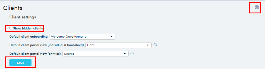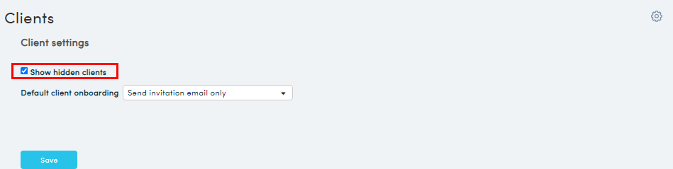 Click on the Settings COG (step 1), untick 'Show hidden clients' and click 'Save'. - Any hidden clients will no longer be visible in the clients’ list.