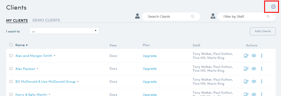 - In the Partner Portal, Clients>Client List, click on the settings COG at the top right of the page.