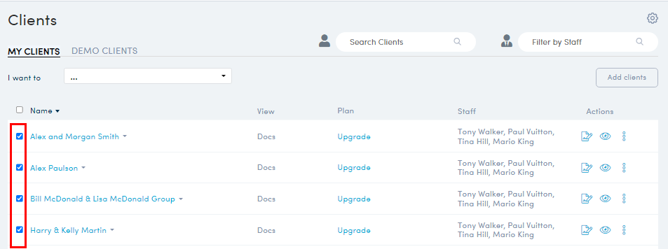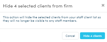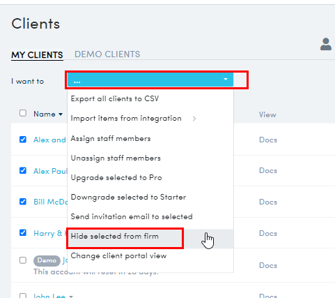 - Once you have chosen who you want to hide, select the 'I want to… ‘ dropdown at the top of the client list, and click ‘Hide selected from firm’.