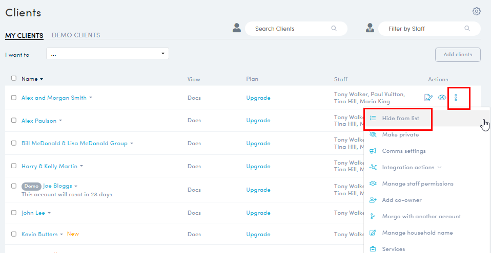 - Find the Client in the Client list, click 'More actions' > 'Hide from list'.