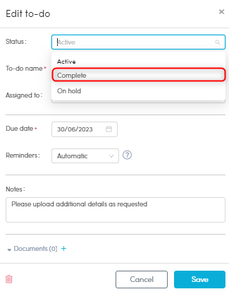 2. Use the filters to find the To-do and click the Status icon. This will open a small drop-down box where you can change the status of the To-do to 'Completed'