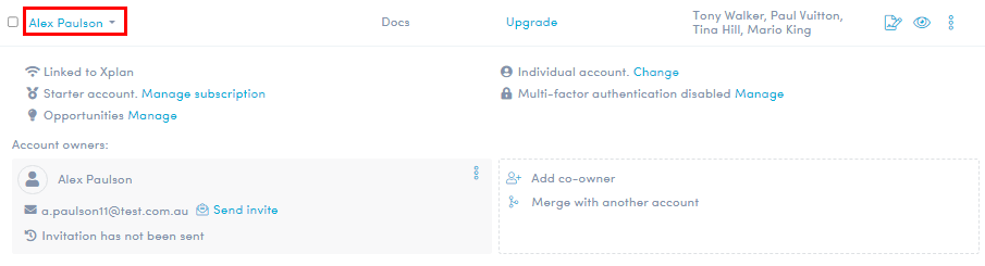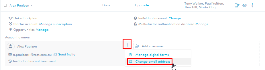 - In the drop down screen, click 'More actions' from within the Account owners area, then click 'Change email address'.