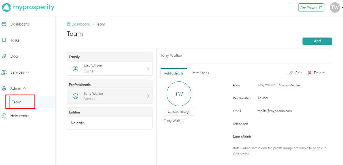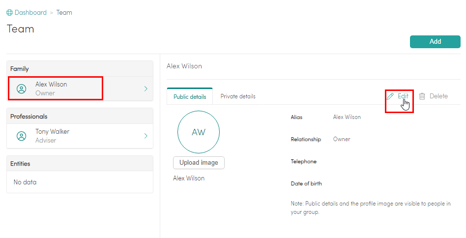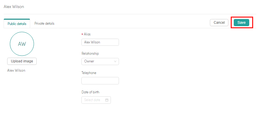 - In the ‘Public details’ section, you can adjust the client’s Alias, their relationship, phone number and date of birth. In the 'Private details' section, you can adjust information like address, gender and contact details.