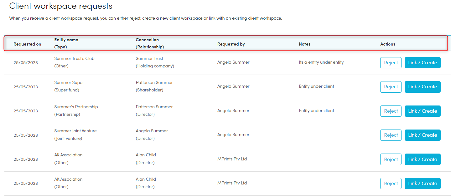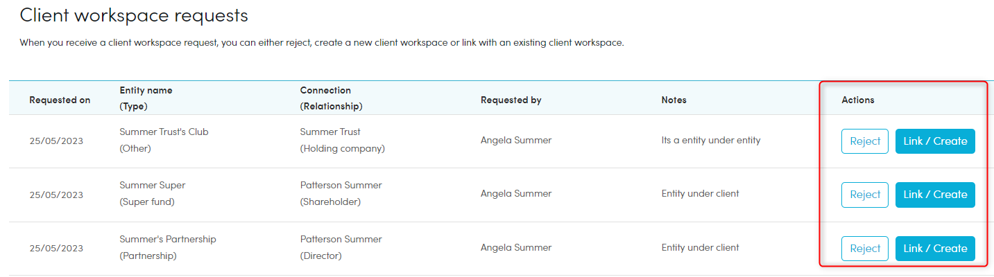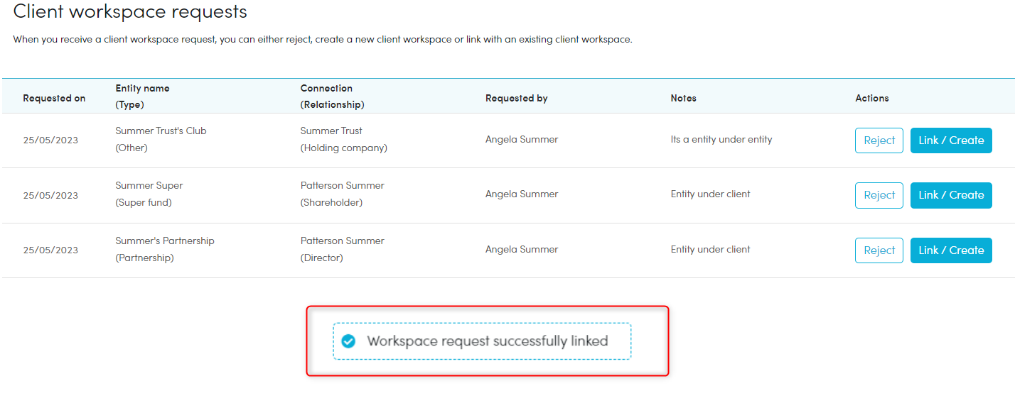 Once you have reviewed the information provided, you have 3 options as to how you would like to handle the request: Reject, Link (to existing client workspace) or Create.