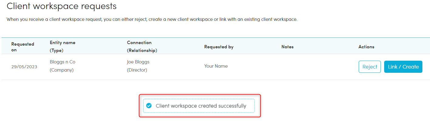 The workspace request screen will show a success message and the new entity can be found as a Client in your Client list.