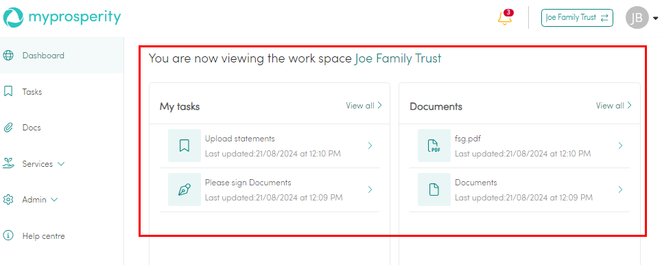 A connection of an entity workspace can easily switch between their personal portal and their connected entity workspace/s - keeping things clean and simple!